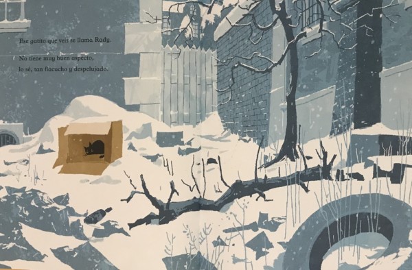 Una mañana de frío  y nieve apareció, en un caja de cartón, un pequeño gatito negro. Estaba muy delgado y despeluchado. Suerte que lo encontraron y, en esa misma caja, lo llevaron hasta un refugio de animales.