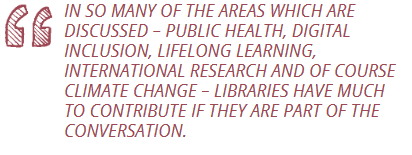 El enfoque más internacional de todo tipo de temas por abarcar desde la salud hasta la inclusión digital y el cambio climático por ejemplo. Este enfoque que traspasa fronteras, exige también que las bibliotecas se involucren también en estos temas, formando parte de la conversación.  La agenda para el desarrollo sostenible y el interés en estos temas a nivel nacional y global son una buen ejemplo de los cambios que afectan también a las bibliotecas.