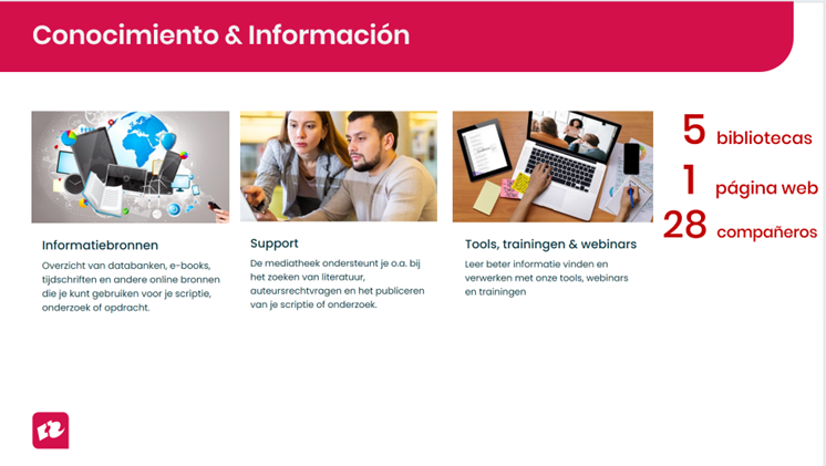 La biblioteca forma parte de la sección Conocimiento & Información Kennis & Informatie en neerlandés. Además del espacio físico, hay cinco bibliotecas en los diferentes edificios de la universidad distribuidos por la ciudad de Rotterdam, la página web de la biblioteca permite el acceso a los libros, e-books y bases de datos que forman parte de las diferentes colecciones. Además a través de esta página se accede también a la información referente a otros servicios de la sección de Conocimiento & Información que incluye apoyo a profesores, alumnos e investigadores sobre diferentes temas de actualidad.