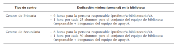 – Desde las administraciones educativas, y en tanto no se establezca la figura del bibliotecario escolar o responsable de biblioteca se debe garantizar un horario mínimo de atención a la biblioteca escolar por parte de un equipo de profesores/as del centro, de forma que se pueda cubrir buena parte del horario lectivo y parte del horario extraescolar, fijando un plazo de tres años para llegar a la dedicación completa de la persona responsable de la biblioteca, de forma que pueda ejercer las funciones que le corresponden, entre las que se encuentra el diseño e implantación de programas para la formación del alumnado en competencias ALFIN/AMI, en colaboración con el resto del profesorado.