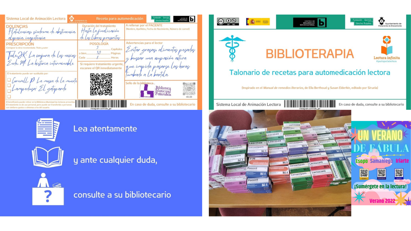 Y las recetas y cajas de medicación de nuestra Biblioterapia, que fueron repartidas en el Centro de Salud y las farmacias y que tanto éxito tuvieron gracias a su viralización en redes y por proponer remedios literarios para males ordinarios.
