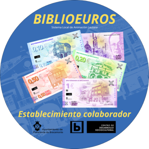 Y una vez con el dinero en nuestro poder, ¿qué podemos hacer con él? Pues lo que hacemos con el de verdad, hay quien lo gasta y hay quien lo guarda. Si decides gastarlo podrás pagar con esos billetes en el mercadillo de libros procedentes del expurgo que todos los años organiza la biblioteca. Este año el precio del kilo de libro expurgado o donado está a 6,99 €, por lo que no resultará difícil hacerse con fondos suficientes para llevarte a casa un par de kilos de libros. Ahora bien, también puedes entregarlos en diferentes establecimientos de la localidad, como librerías, fruterías, panadería, tienda de dulces y churrería. No creo que la iniciativa potencie el comercio local, sino más bien le implica en proyectos que tienen que ver con el fomento lector y eso es una manera de tender redes. Nuestros usuarios identificarán donde pueden gastar sus billetes gracias a un distintivo como este: