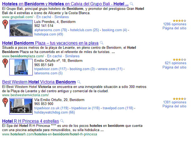 Google consciente de que el 20% de las búsquedas que se realizan en buscadores son locales, revoluciona el modo de mostrar esa información local, pasando de la información en forma de caja a fusionarla con los resultados orgánicos. De modo que si realizamos búsquedas como “hotel Benidorm” nos devuelve: