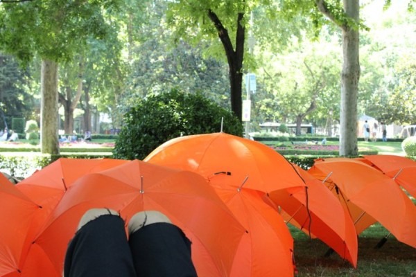 Paraguas rojos que simbolizan el fuego y son utilizados por las personas libro en sus narraciones.Cualquier lugar es bueno para narrar en público. Los encuentros de personas libro para poner voz a las palabras almacenadas en la memoria resultan muy atractivos y vistosos. Los paraguas naranjas simbolizan el fuego y rodean a las personas libro, que con su labor consiguen que las llamas no destruyan las palabras. Se trata de una escenografía fácil de montar en cualquier calle, que atrae a la gente y acoge a quienes narran sus textos.